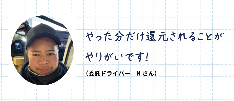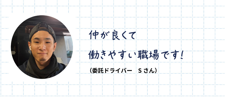 採用情報 株式会社ジークでは、一緒に働くドライバーを募集しています。学生さん、配送業初めての方も大歓迎です!また、弊社のInstagramで実際のお仕事の様子など発信しておりますのでご覧ください。 ドライバーの声 (株)Siegで軽貨物運送業にデビューしました。初めての業界で最初は不安でしたが周りの方がサポートしてくれたおかげですぐに独り立ちできました!やった分だけしっかりお金に還元されるのがやりがいになっています。 (株)Siegでは立ち上げから委託ドライバーとして稼働しています!所属している社員さんや委託ドライバーが30代前後と年齢が近いこともあり仲がいいため働きやすいです。定期的にある飲み会なども楽しみの一つです。 出勤までの距離が長く、最初は数か月だけのつもりでしたが社員さんのサポートや自分のペースでできるこの仕事が楽しくなり、 今でも続けています。未経験で入った業界でしたが始めて良かったと今では思っています。